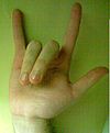 If anyone thinks this is a gesture of the occult or satanism used by rock bands and the like, that is wrong. This hand gesture is the ILY sign from the American Sign Language. It combines the letters "I", "L", "Y". It is sign language for an informal expression of love. Bottomline: a symbol can mean one thing to one person and quite another thing to some one else. And, what may appear to be a symbol of something may be nothing at all. We can never jump to conclusions and must be very careful about this sort of thing, especially if the inference is negative. I say this to the general readers. As for your question specifically, I do not thing the way the hand is being held means anything at all. God Bless, Footer Notes: This forum is for general questions on the faith. See specific Topic Forums below: Spiritual Warfare, demons, the occult go to our Spiritul Warfare Q&S Forum. Liturgy Questions go to our Liturgy and Liturgical Law Q&A Forum Liturgy of the Hours (Divine Office) Questions go to our Divine Office Q&A Forum Defenfing the Faith Questions go to our Defending the Faith Q&A Forum Church History Questions go to our Church History Q&A Forum